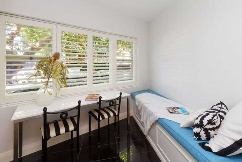 - Balcony-style separate sun room or study with built-in daybed, storage areas, plantation shutters and bonus harbor cameos